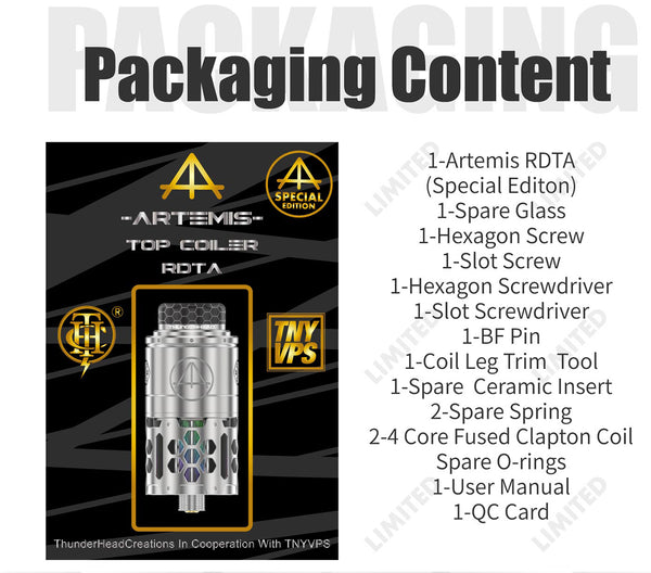ThunderHead Creations Artemis RDTA Special Edition is the GLOBAL LIMITED edition and quantity 1666pcs only, collaborated with TNYVPS and breaking through itself from its standard edition and create a new, artistic, and design RDTA. Compared to the Standard, it earns awesome craftwork from its stylish engraving from both the exterior and interior, adding the newly designed LOGO engraving and honeycomb engraving at the bottom, as well as updating its silver-plated build deck and matt finishing. The main 4-Germany rainbow standard wicking steel differs from its black standard, view from honeycomb glass shield, it enormously creastes the huge cloud and aftertaste.