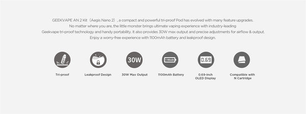 Geekvape AN2 Kit (Aegis Nano 2), a compact and powerful tri-proof Pod has evolved with many feature upgrades. No matter where you are, the little monster brings ultimate vaping experience...