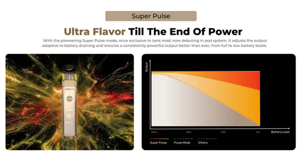 Equipped with COREX 3.0 heating technology and an advanced Hive Mesh structure, the XROS PRO 2 delivers delicate flavor, smoother vapor, and consistent output from the first puff to the last. The innovative Super Pulse Mode, once exclusive to tank mods, ensures powerful, stable performance even as the battery drains.